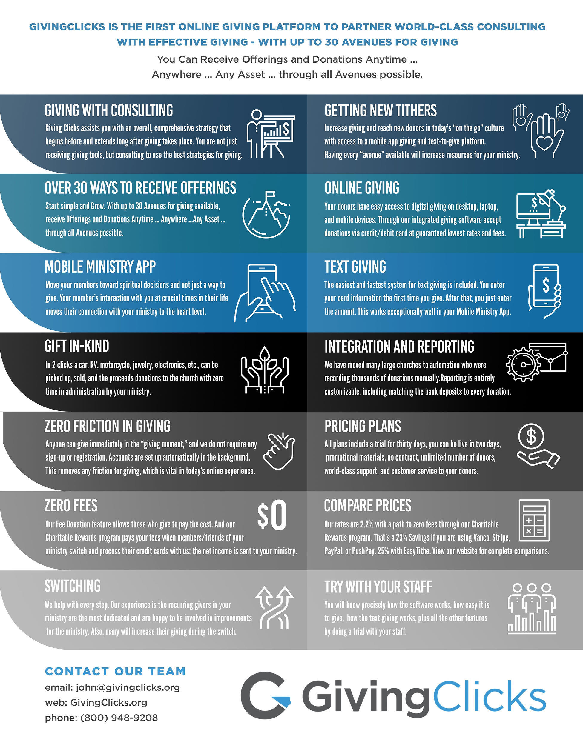 Today, more than ever, ministries need more resources.And yet, 60 percent have never given a dime to their church. With thirty years of experience, serving hundreds of ministries. Giving Clicks opens new avenues of giving, makes giving rewarding, transforming giving into